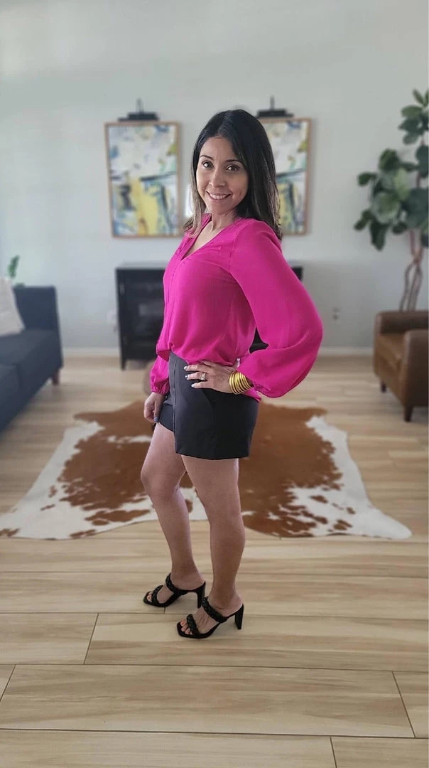 Need a new solid staple for the closet? Order this super cute and versatile top that features a beautiful V-detailed stitched neckline and elastic-lined wrists. Goes great with denim or front tucked with these classy black high-waisted shorts!
