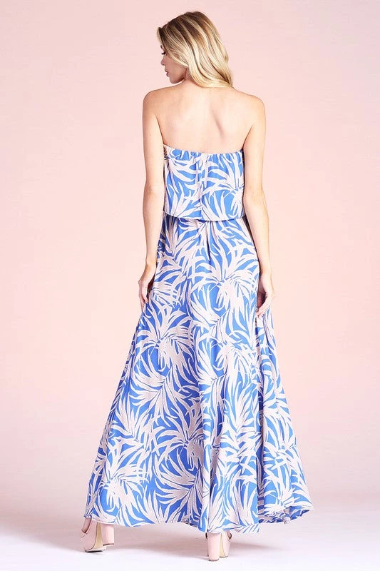 Are you ready for dinner night on that upcoming vacation? You will look amazing with your flow into the room with our blue palm print strapless maxi dress
