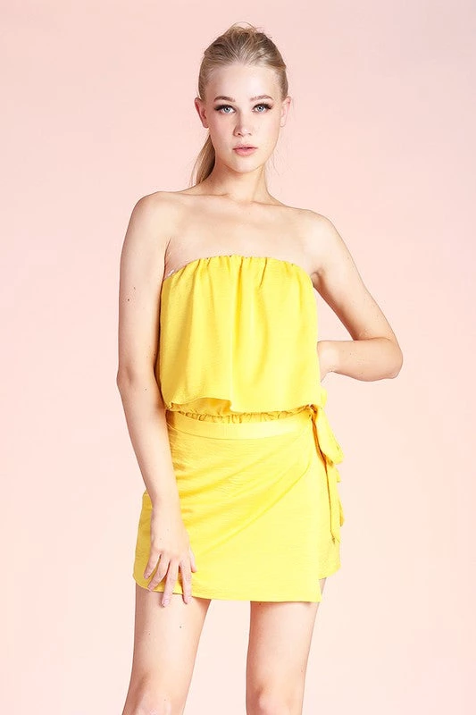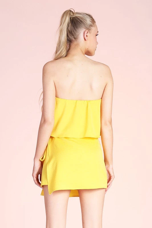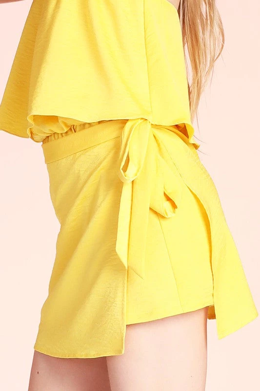 Are you looking for a cute yellow romper that says I’m ready for summer? You will love our sunny yellow washed satin wrap romper with your favorite sandals for wedges