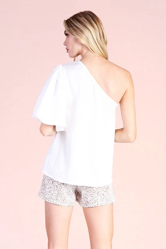 Are you looking for the perfect top with some personality? You will love our white satin one bubble sleeve top pair with your favorite dress shorts or pants