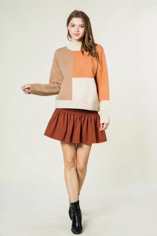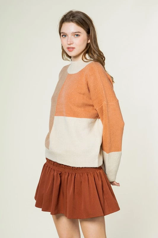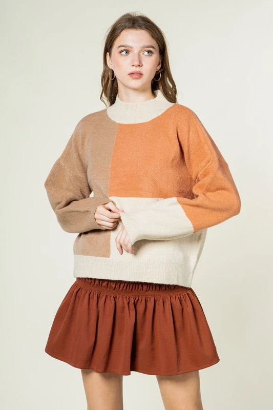 Are you looking for the perfect oversized sweater with those fall vibes? Check out our blush color block oversized turtleneck sweater