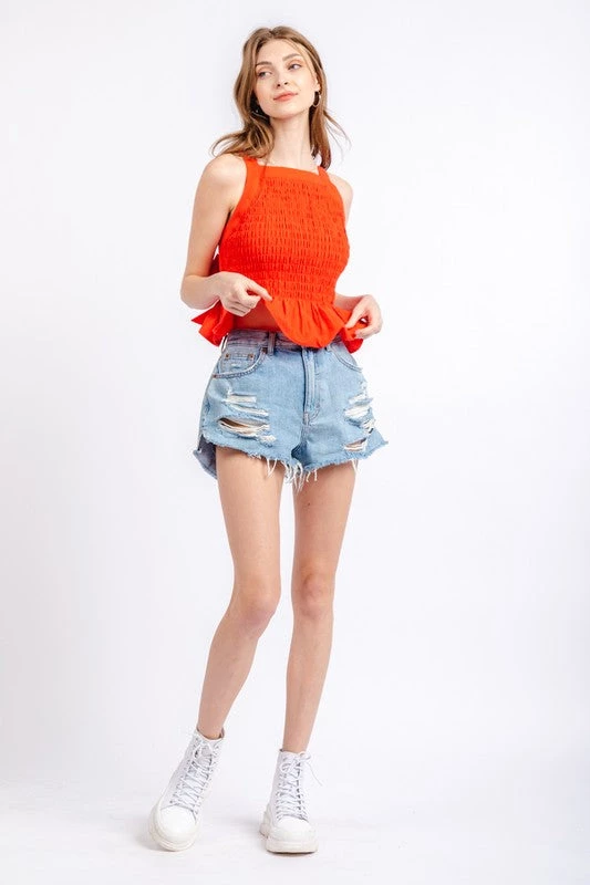 Are you searching for a cute red summer top? You will love our red back tie detail front smocked top paired with your favorite denim cut-offs and sandals