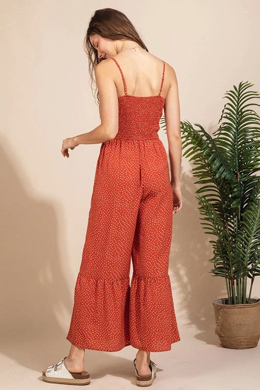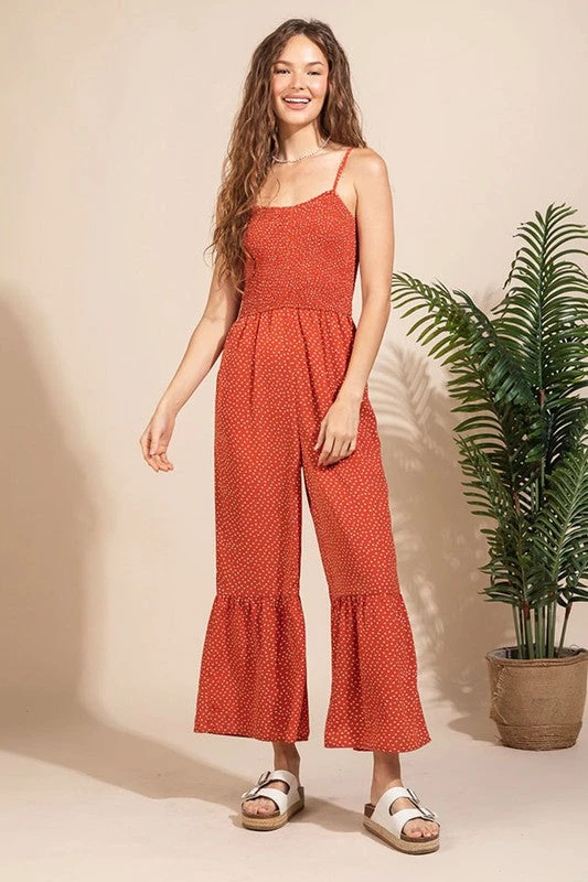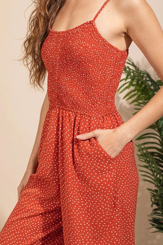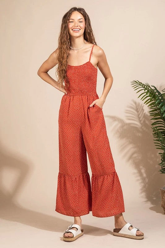 Are you looking for the perfect jumpsuit with those fun and relaxed vibes? You will love our rust-colored smocked spotted print flare jumpsuit