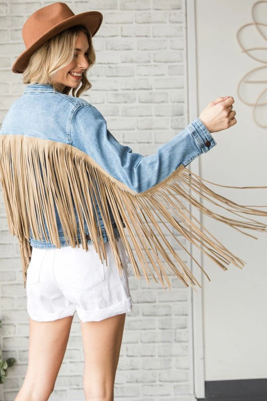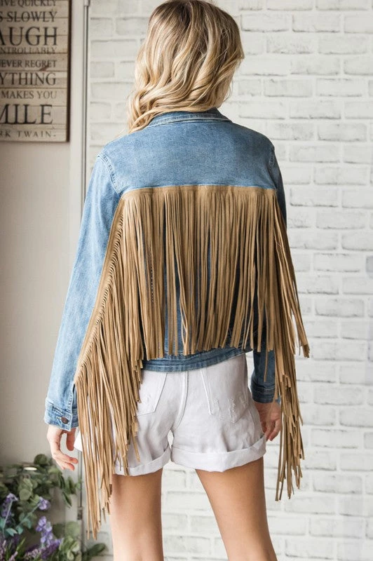 Are you ready to be the envy of everyone with your new killer denim jacket? Get ready to fall in love with our Dolly medium wash denim and suede fringe jacket